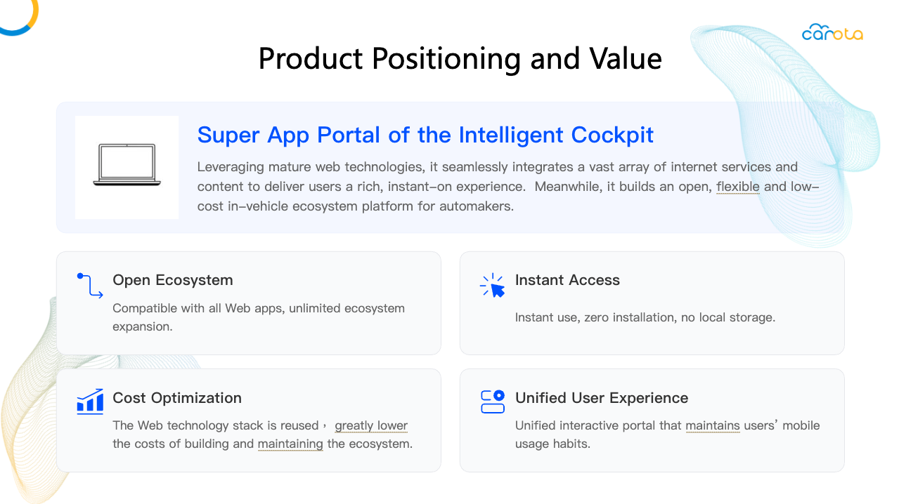 Carota has cultivated a long-standing, strategic partnership with BAIC Group. In prior collaboration, Carota delivered comprehensive OTA validation services for BAIC’s Magic Cube model platform—systematically verifying critical aspects including the end-to-end vehicle OTA upgrade workflow and functional stability under diverse operational conditions. Leveraging our robust, regulatory-compliant technical infrastructure, Carota has consistently supported BAIC in achieving end-to-end software lifecycle management and continuous iteration of intelligent vehicle functionalities. Building on this foundation, both parties have recently formalized an expanded collaboration: Carota will supply a production-grade, embedded in-vehicle browser solution tailored to BAIC’s full-platform intelligent cockpit architecture.